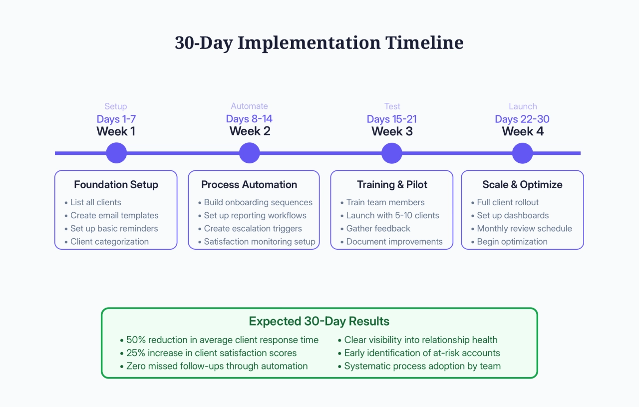 Building systematic relationship management doesn’t require months of preparation. Here’s your week-by-week implementation guide for the comprehensive framework.