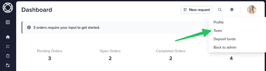 To add members to a client team, click on your profile photo in the top right hand corner, and choose “Your team.”
