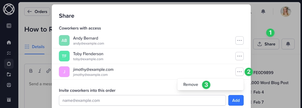 Manually added team members can also be removed at any time by clicking on the Share button again, and removing them from there then saving the changes: